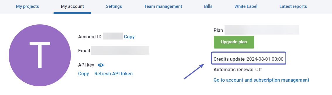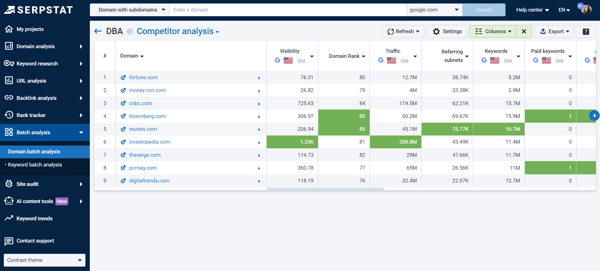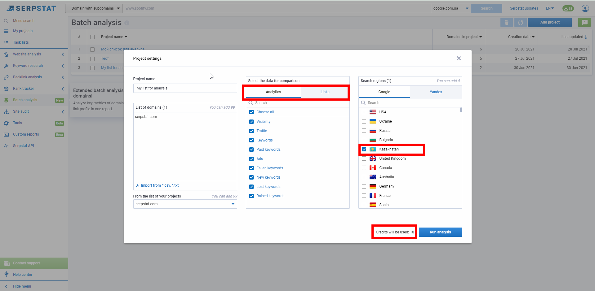 Number of domains * number of metrics = numbers of credits. 1 metric = 1 credit Metrics for analysis are parameters chosen in settings, such as keywords, visibility, Domain rank, ads, backlinks, etc. Example: 1 domain * 20 metrics for analysis (9 metrics for analytics + 11 metrics for links) * 1 base = 20 credits. Regions are not considered for Links analysis. Analysis of 2 bases = 40 credits: 11 credits for link analysis + 9 credits for domain analysis * 2 bases. Check the credits for Domain batch analysis in your account. Please note: credits for Keywords batch analysis, Domains batch analysis, Clustering, Text analysis, and AI content tools are shared.