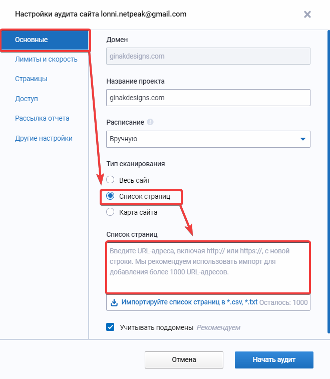 Enter the required addresses in the input field → set the frequency of checking and sending reports → to click on the "Enable mailing" button → click "Save."