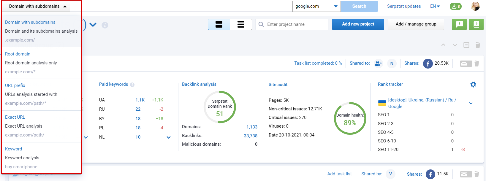 When you select Domain with subdomains, all subdomains of the analyzed domain and the number of their keywords will be taken into account. If you select URL Prefix, the analysis will be carried out according to the selected domain prefix, for example serpstat.com/blog.