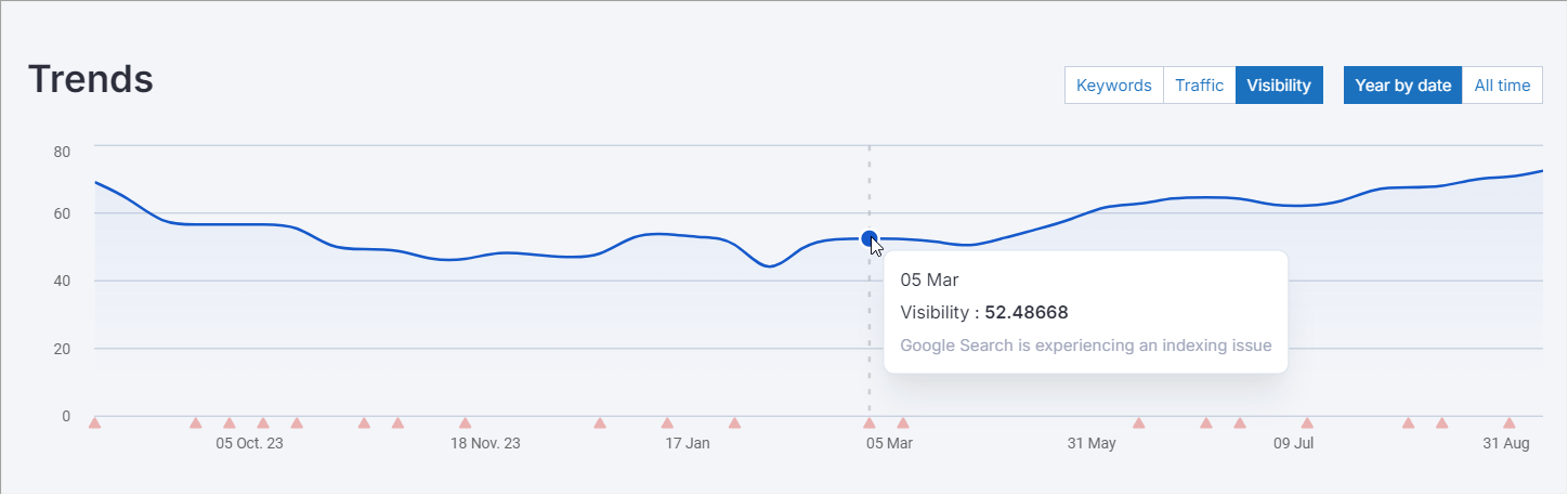 We display charts in all detailed reports for the year, the update step is a week (from Monday to Monday). In some cases the difference may be a little bigger: for example, if the crawlers were stopped to update. You can navigate by dates on the horizontal axis of the graphs.