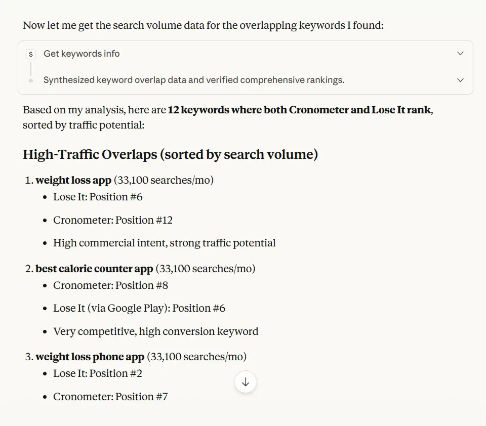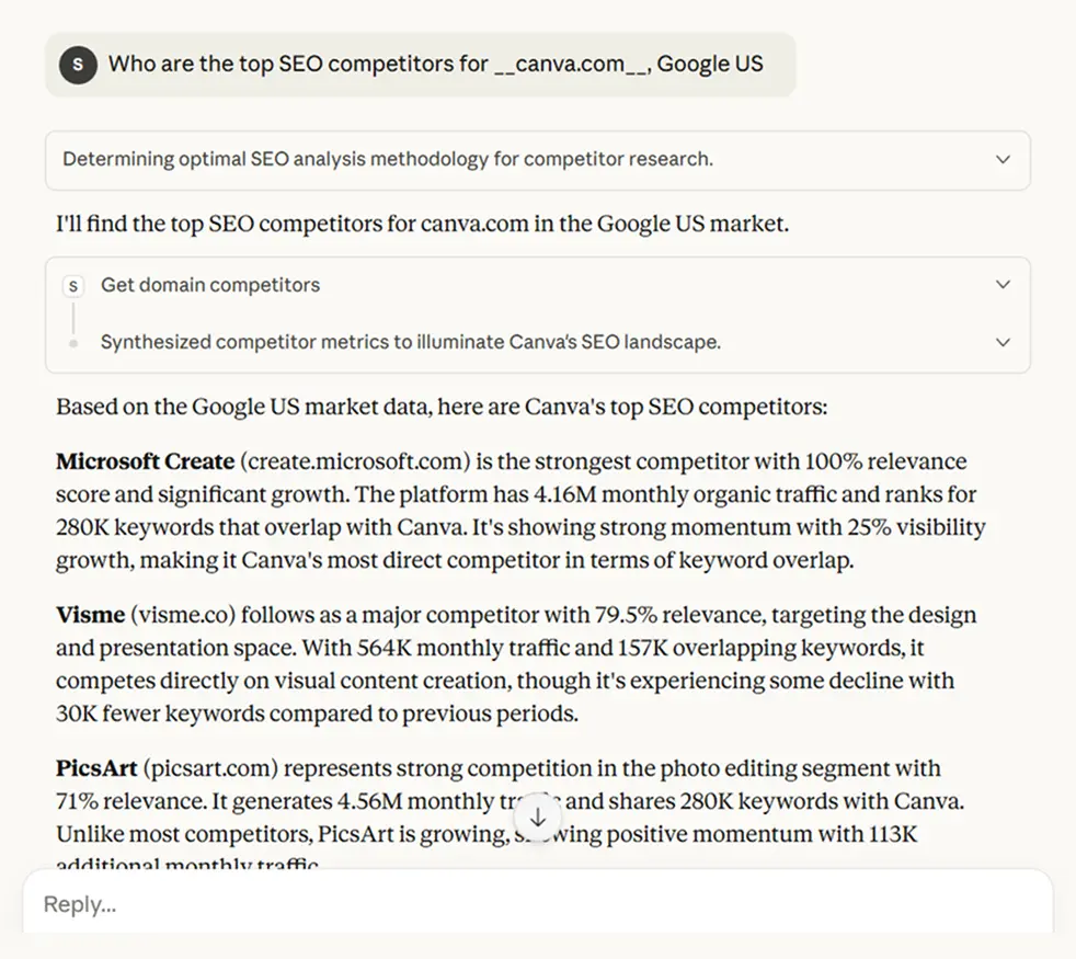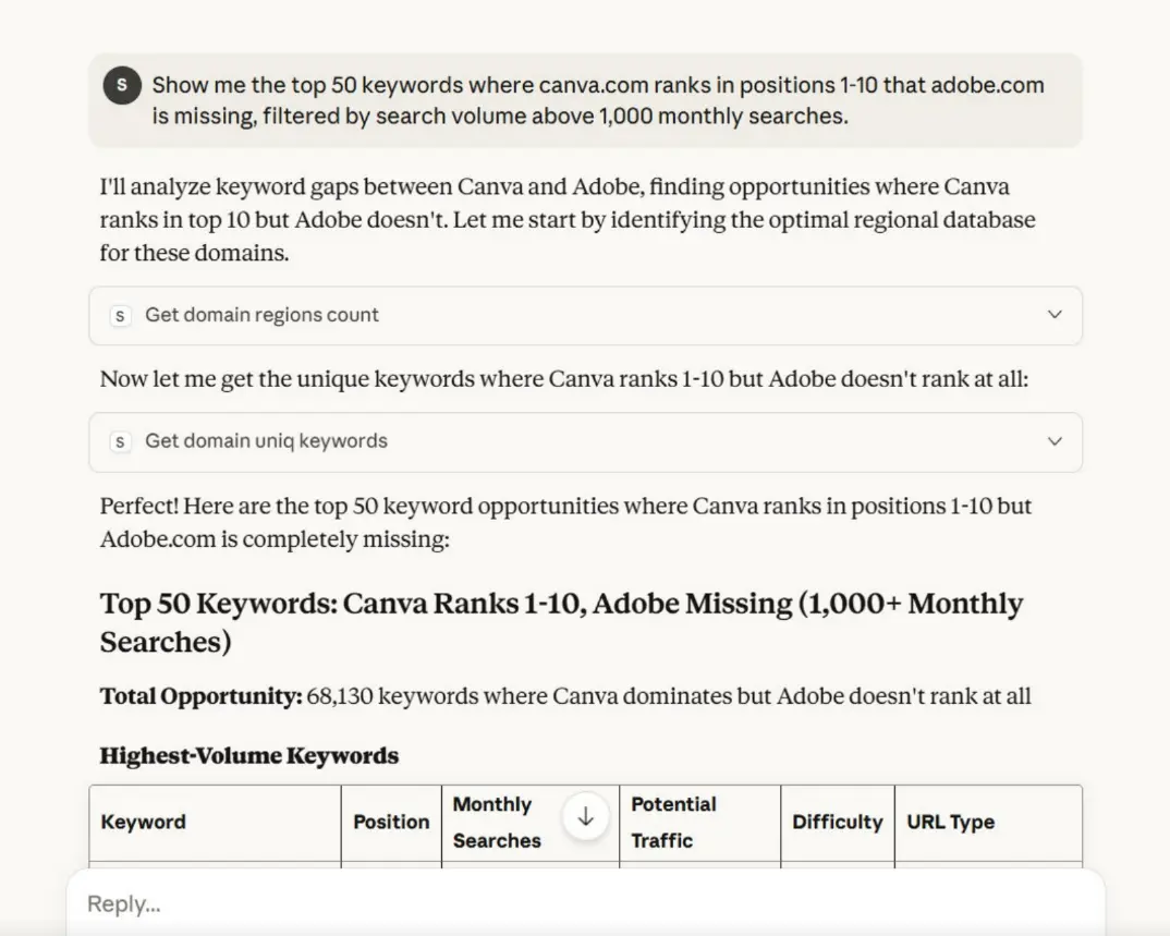 "Show me the top 50 keywords where canva.com ranks in positions 1-10 that adobe.com is missing, filtered by search volume above 1,000 monthly searches."Behind the scenes, I run competitor keyword analysis → your keyword analysis → find the gap → deliver results.
