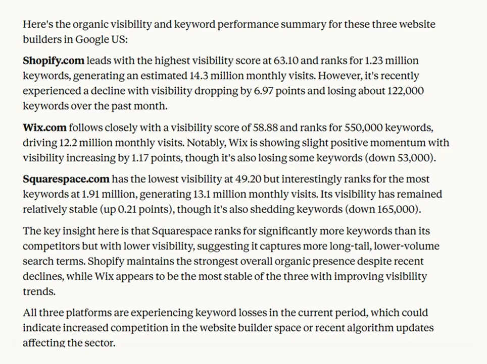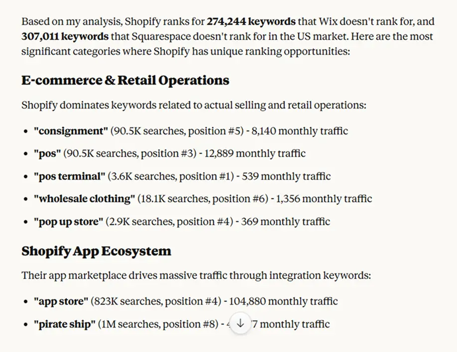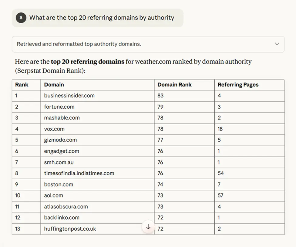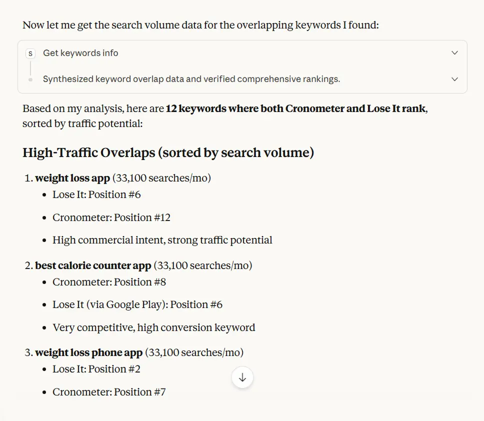 The entire workflow with Serpstat MCP took a couple prompts and way less time. Doing this manually would take an hour of tab-switching and spreadsheet work.