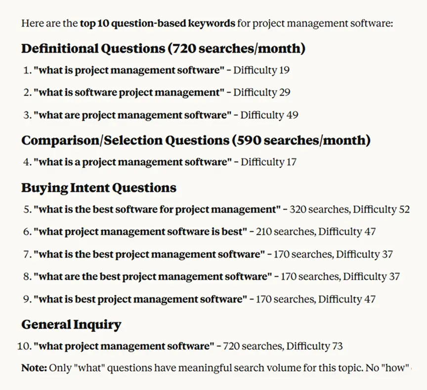 This filters for "how to," "what is," "why does" type queries depending on your prompt. These are typically informational intent—perfect for blog content that brings people into your funnel. You might find "what is software project management" or "what is the best project management software"—these are top-of-funnel content opportunities that bigger competitors often ignore.