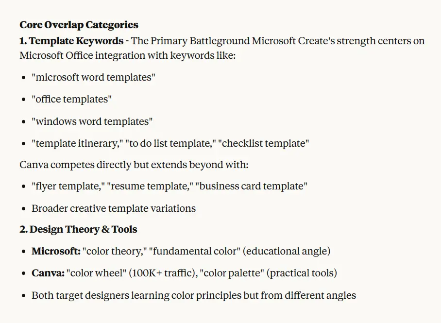 Once you see the list: "Show me the keyword overlap between canva.com and the top competitor: create.microsoft.com for Google CA"