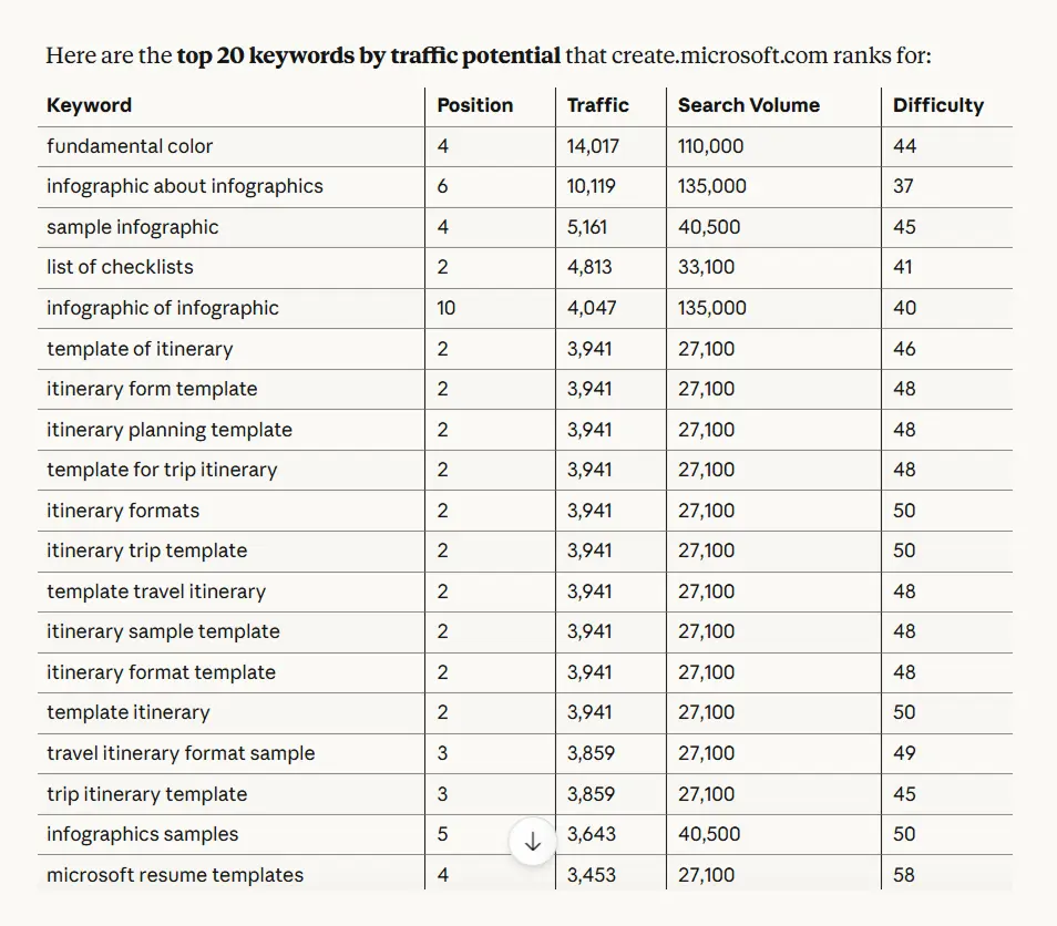 This tells you what you're both fighting for. Then the critical question: "List keywords that create.microsoft.com ranks for but canva.com doesn't. Limit to the top 20 by traffic potential?"