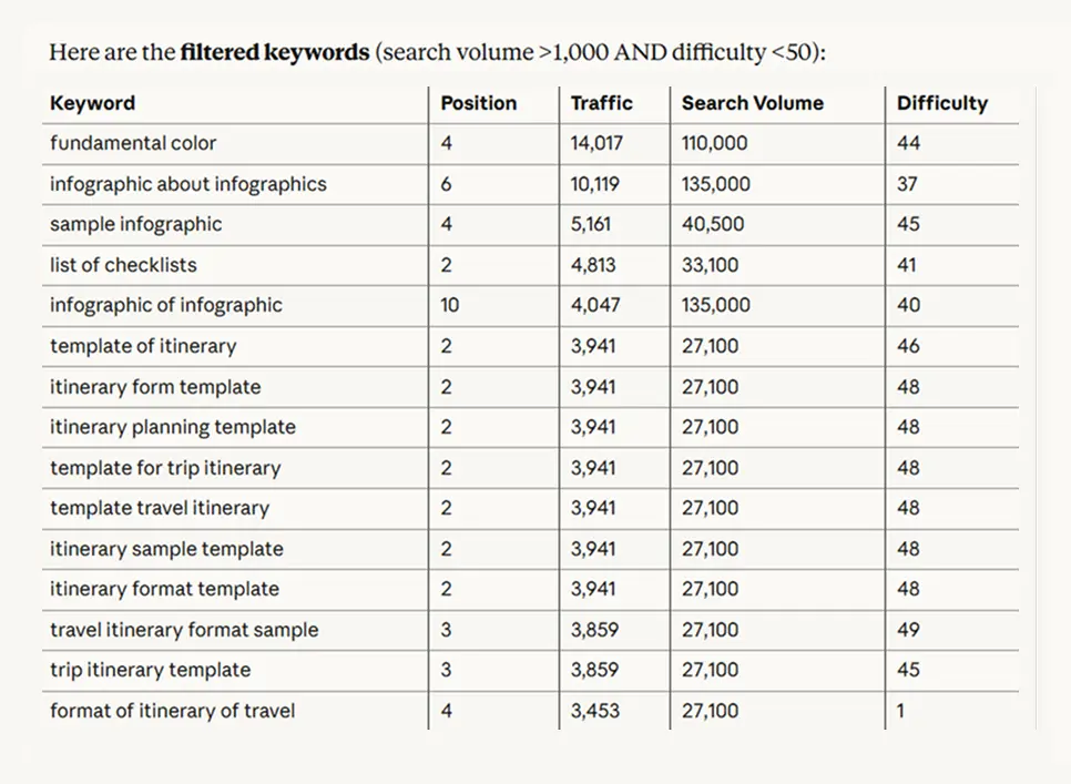The most practical use of domain analysis isn't just seeing that a competitor has 50,000 keywords. It's identifying which of those keywords matter. Try this approach: