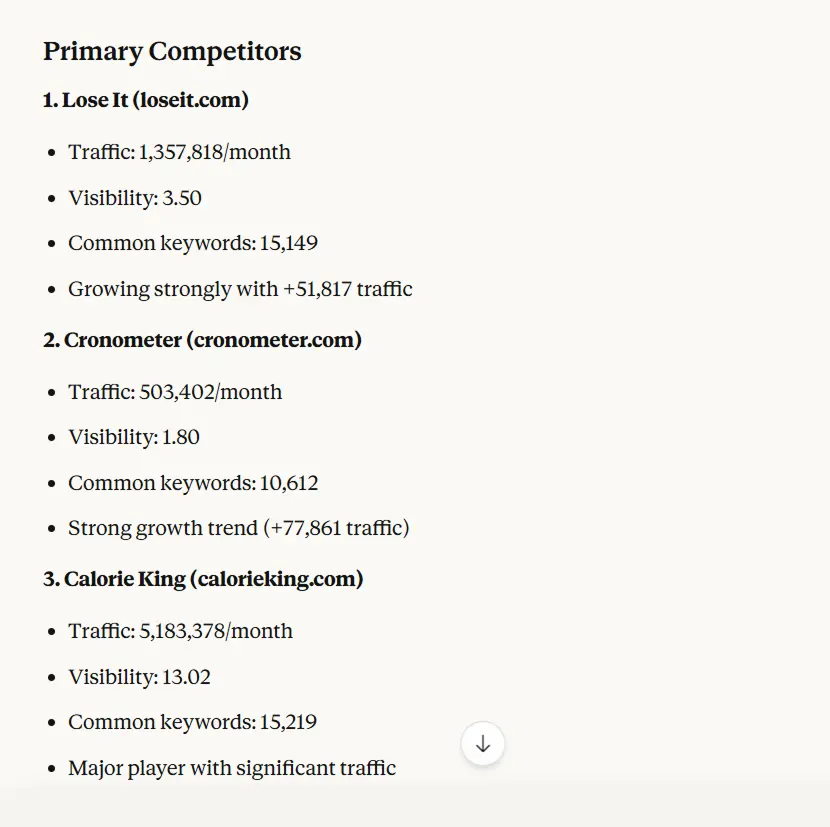 I calculate based on shared keyword rankings — not brand size. You might discover that your real competitor isn't the industry leader—it's a content site that ranks for all the informational queries your audience searches before buying.