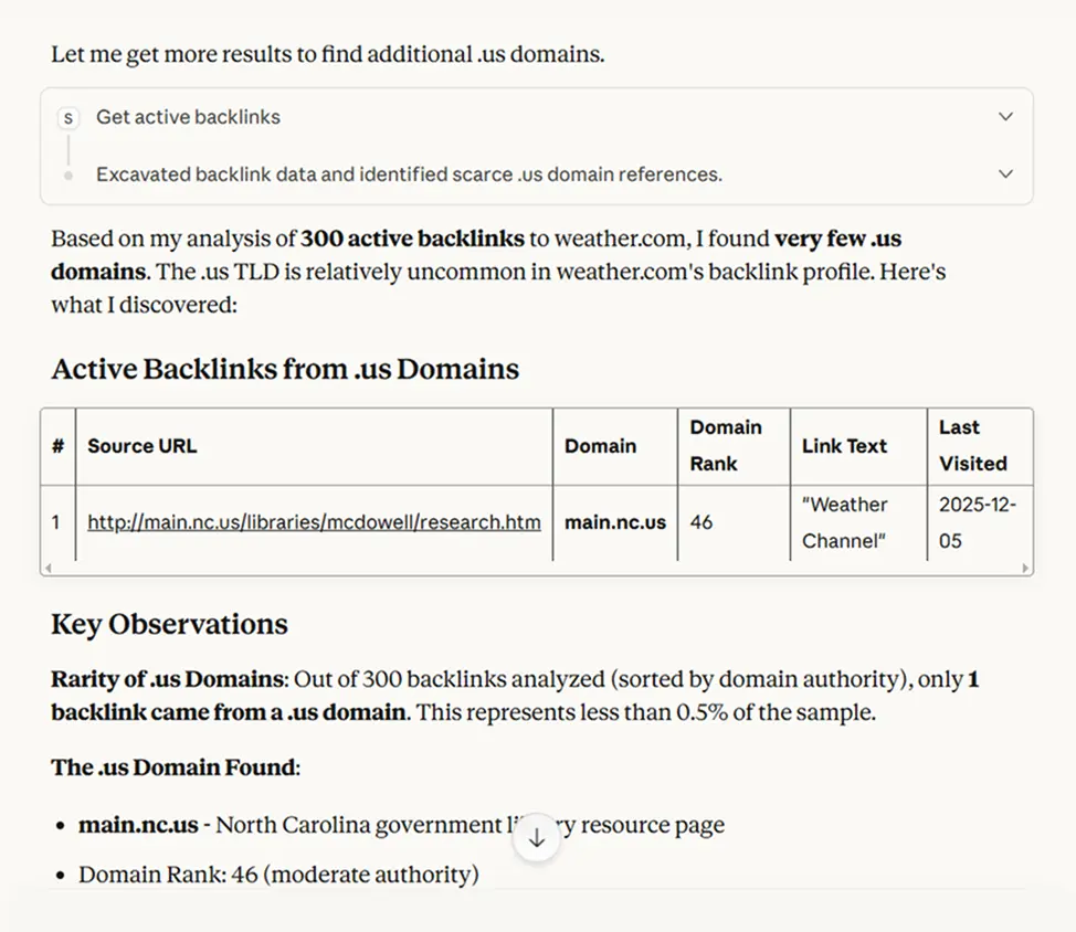 The next move: "Show me active backlinks from .us domains to weather.com"
