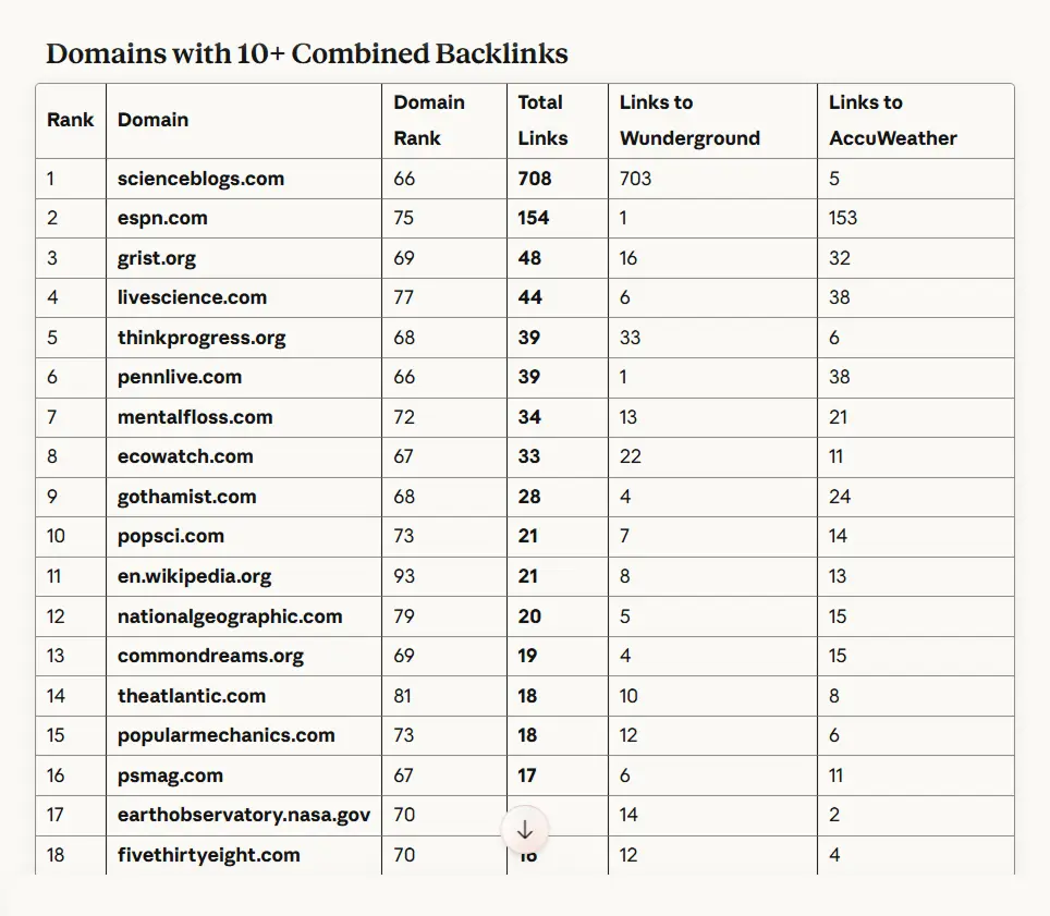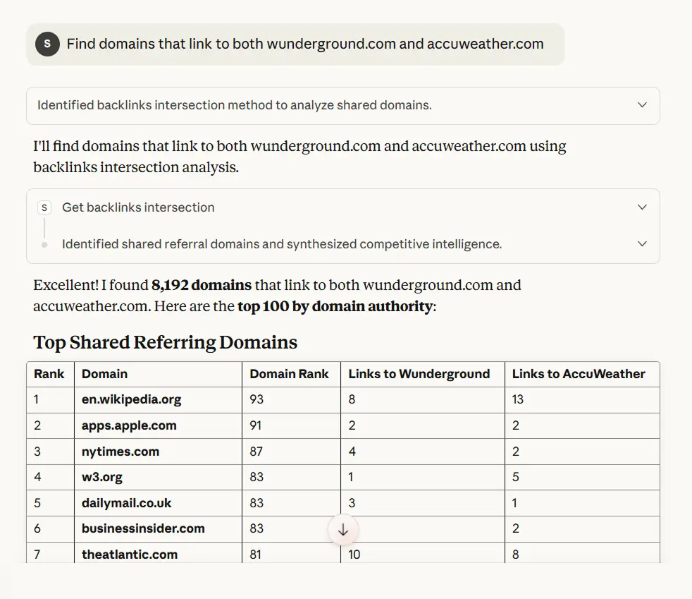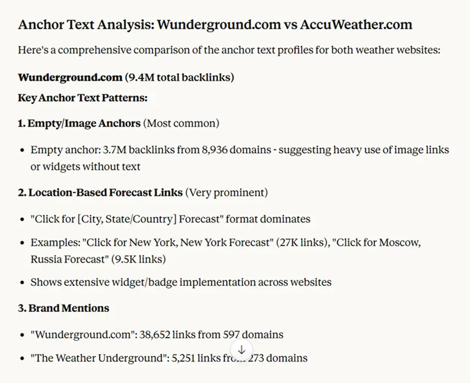 We filter for authoritative sites that already link to your niche twice. They're your warmest outreach targets. You can even ask: "What are the anchor texts and context of both wunderground.com and accuweather.com?" to understand what type of content or offering got them the links in the first place.