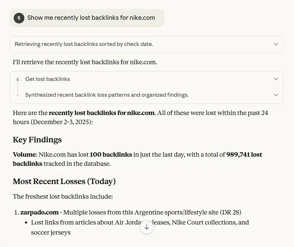 "Show me recently lost backlinks for nike.com"