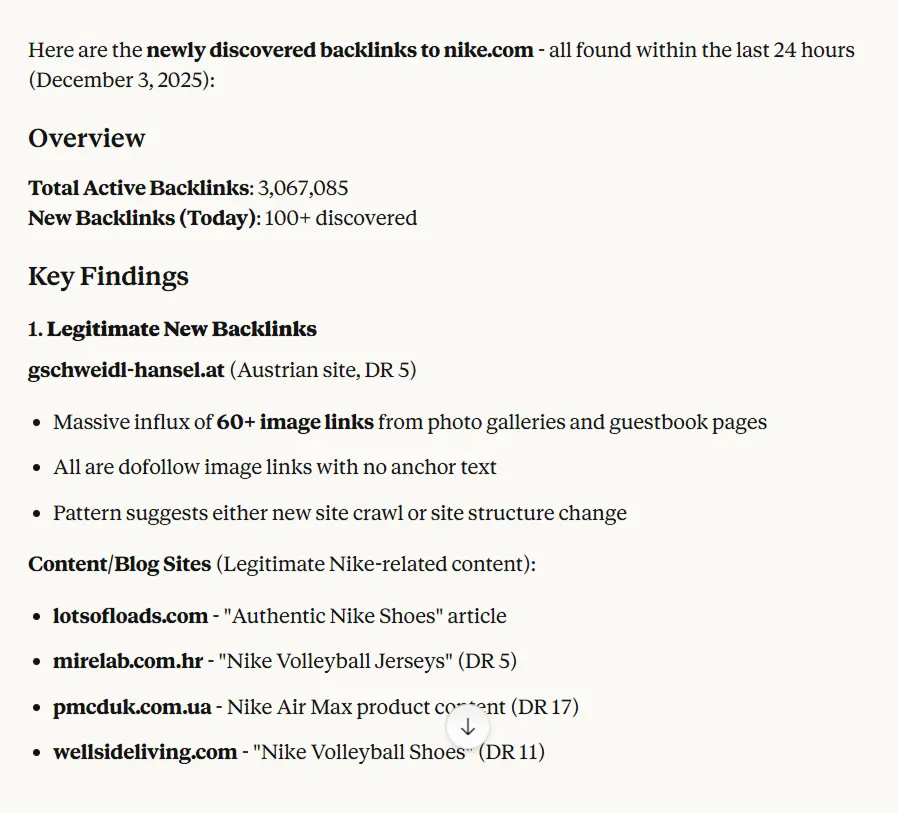 "Show me new backlinks to nike.com from the last 24 hours"