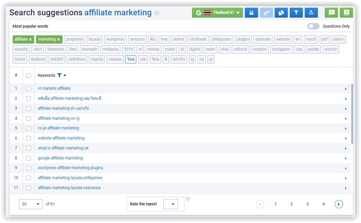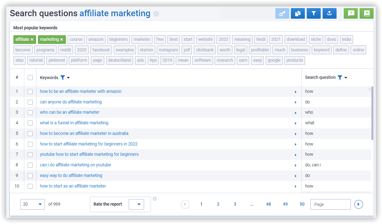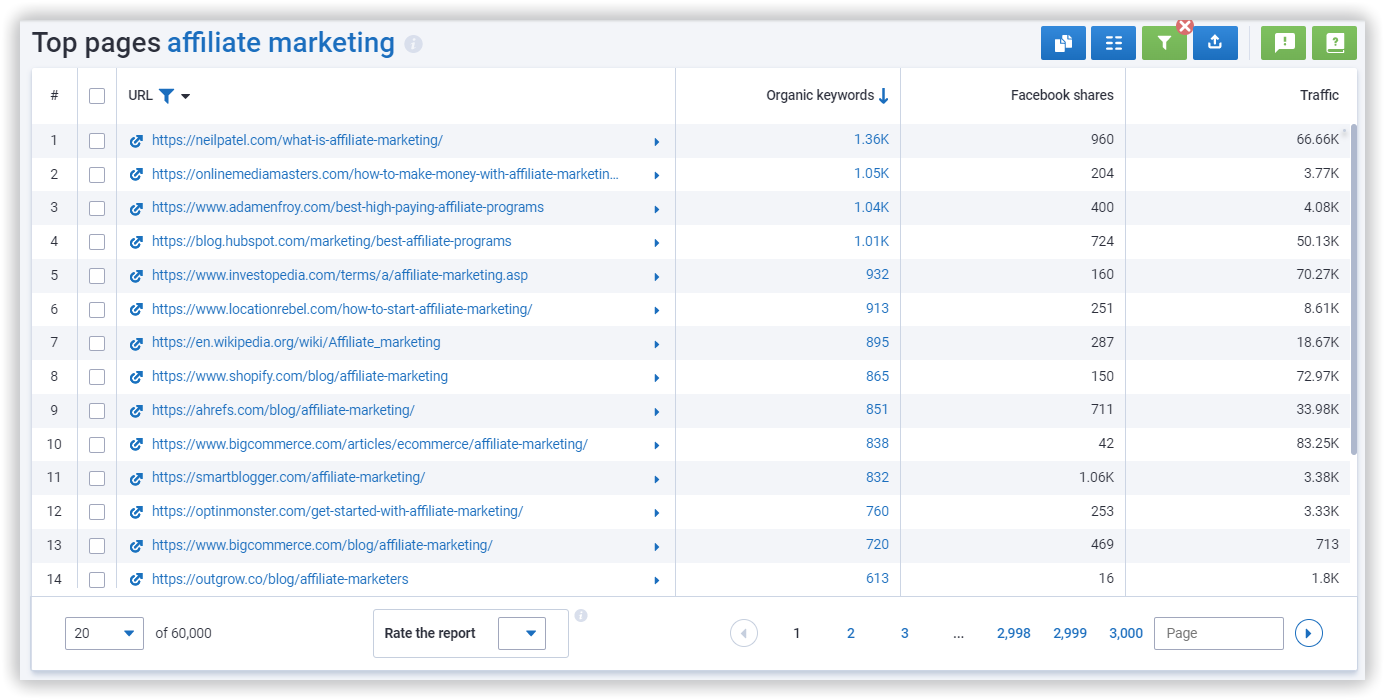 To do that, you can enter any keyword of interest into the search bar (in our case, it's affiliate marketing) and go to the Keyword Research tool → SEO Research → Top Pages report.