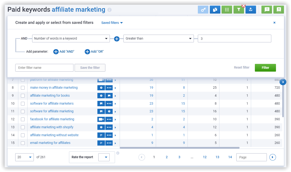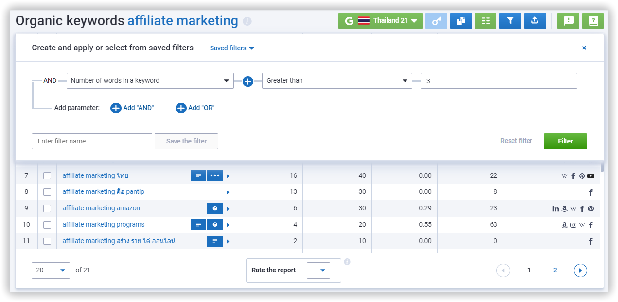 To find such keywords, we use several Serpstat reports. First, we go to the Keyword Research tool → SEO Research → Keyword Selection. Then, we apply filters: select a Number of words in a keyword → Greater than → [number of words]: