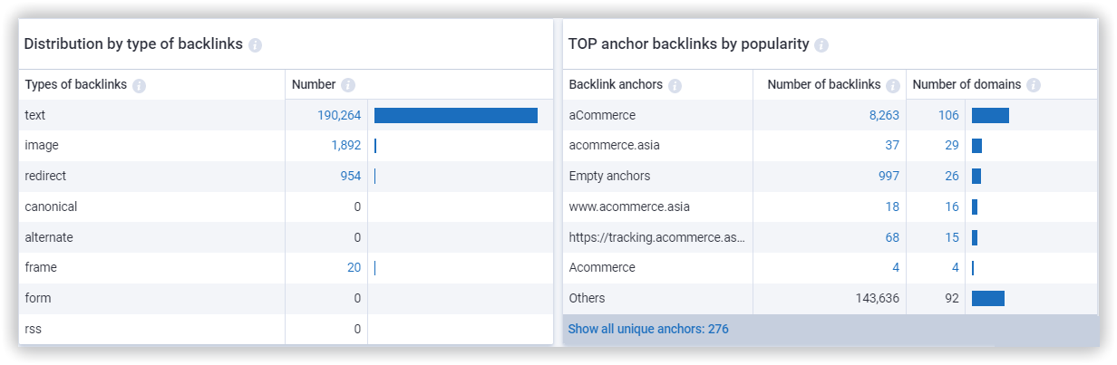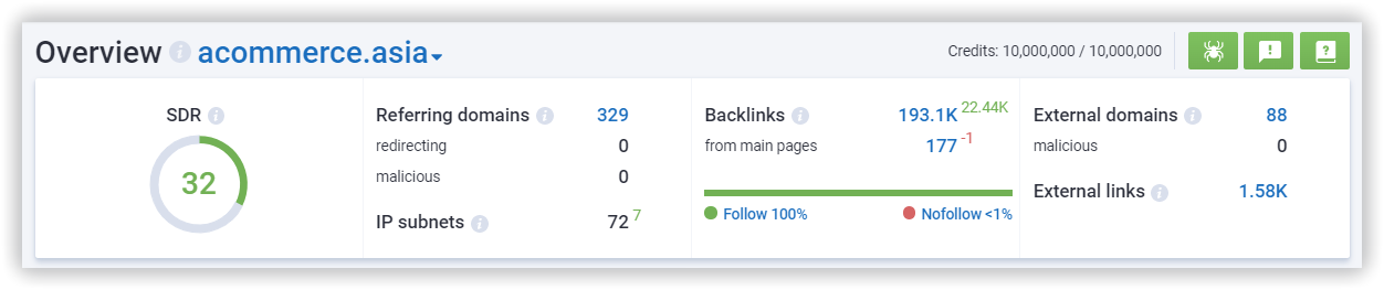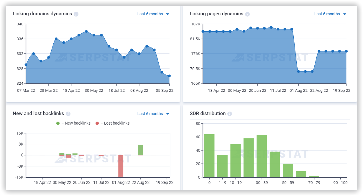 In the Backlink Dashboard report of the Serpstat Backlink Analysis tool, we can find general information about our website's (or competitor's) backlink profile: referring domains and subdomains, referring homepages, IP addresses and subnets, anchors, a domain authority indicator, and more.