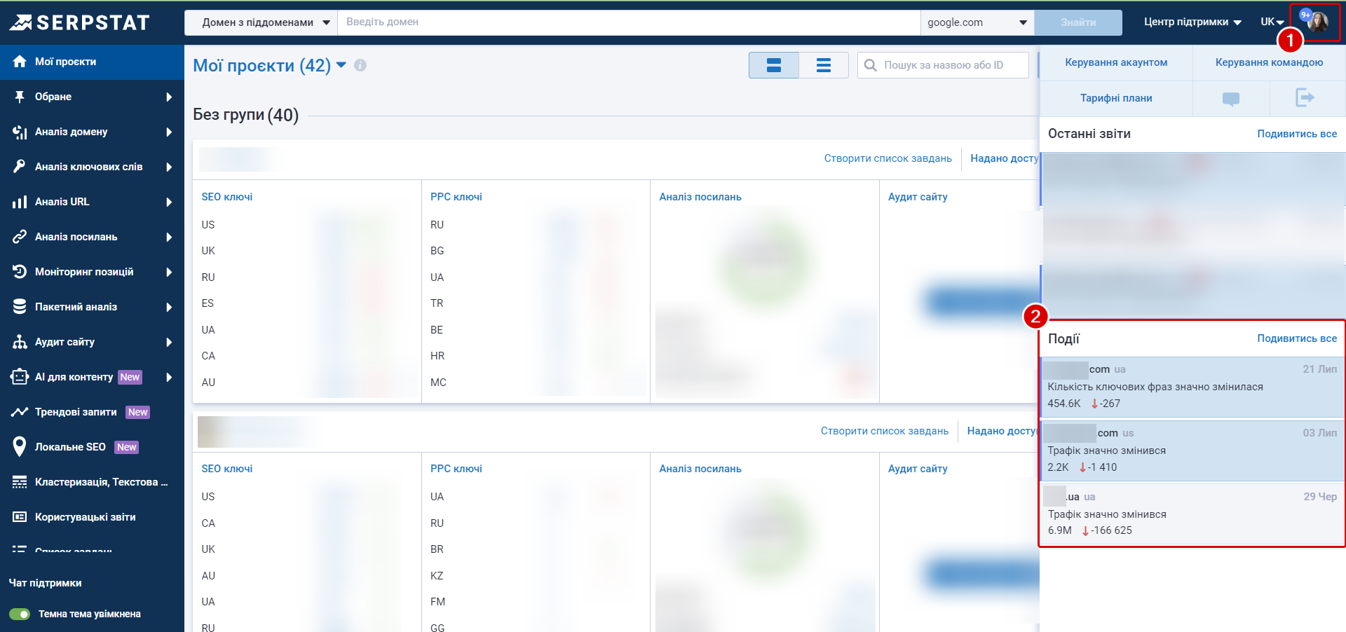 Отримуйте інсайти від ШІ про різкі зміни у видимості, трафіку та ключових фразах ваших проєктів. Аналізуйте їх якнайшвидше, щоб скоригувати SEO-стратегію.