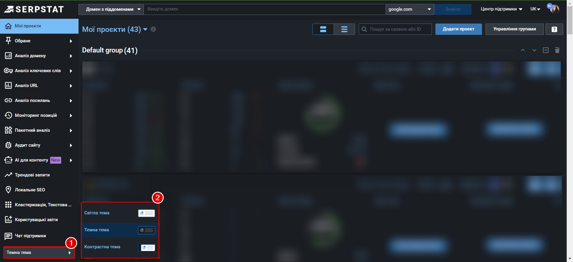 Переходьте на темну сторону перемикнувши тему внизу лівого меню. Або обирайте іншу тему до смаку: контрастну чи світлу.