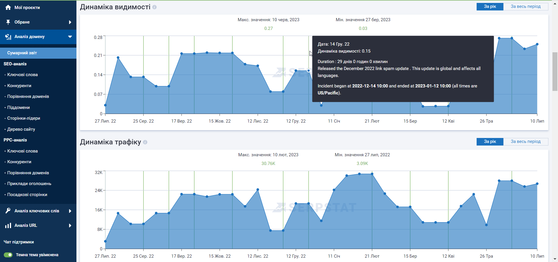 Відстежуйте оновлення алгоритмів Google на графіках динаміки розділа «Аналіз домену». Аналізуйте, як оновлення впливають на SEO вашого сайту та адаптуйте стратегію просування в пошуку.