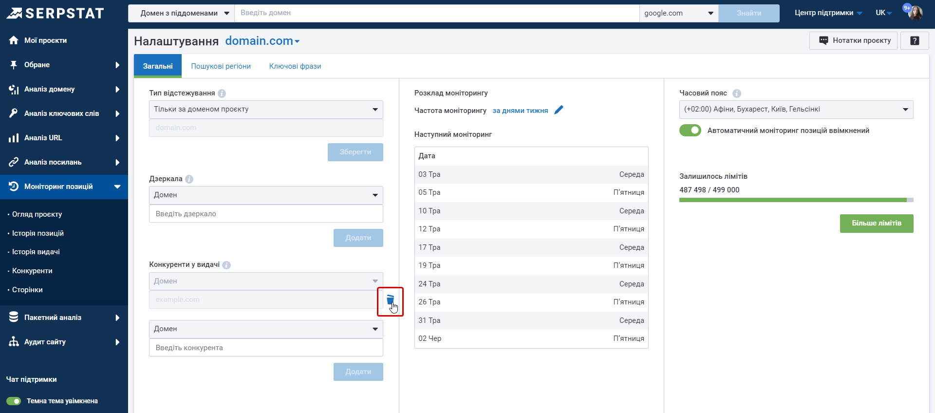 Видаліть конкурента або дзеркало через «Налаштування», коли немає більше необхідності відстежувати їх у проєкті. Наведіть курсор на домен і натисніть кнопку кошика.