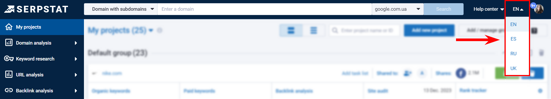 We extended language markup for keyword data. In addition to UA and US databases, a language column is now available for Google Canada, France, the United Kingdom, and Germany — both in Keyword Research and in Site Analysis → Keywords.