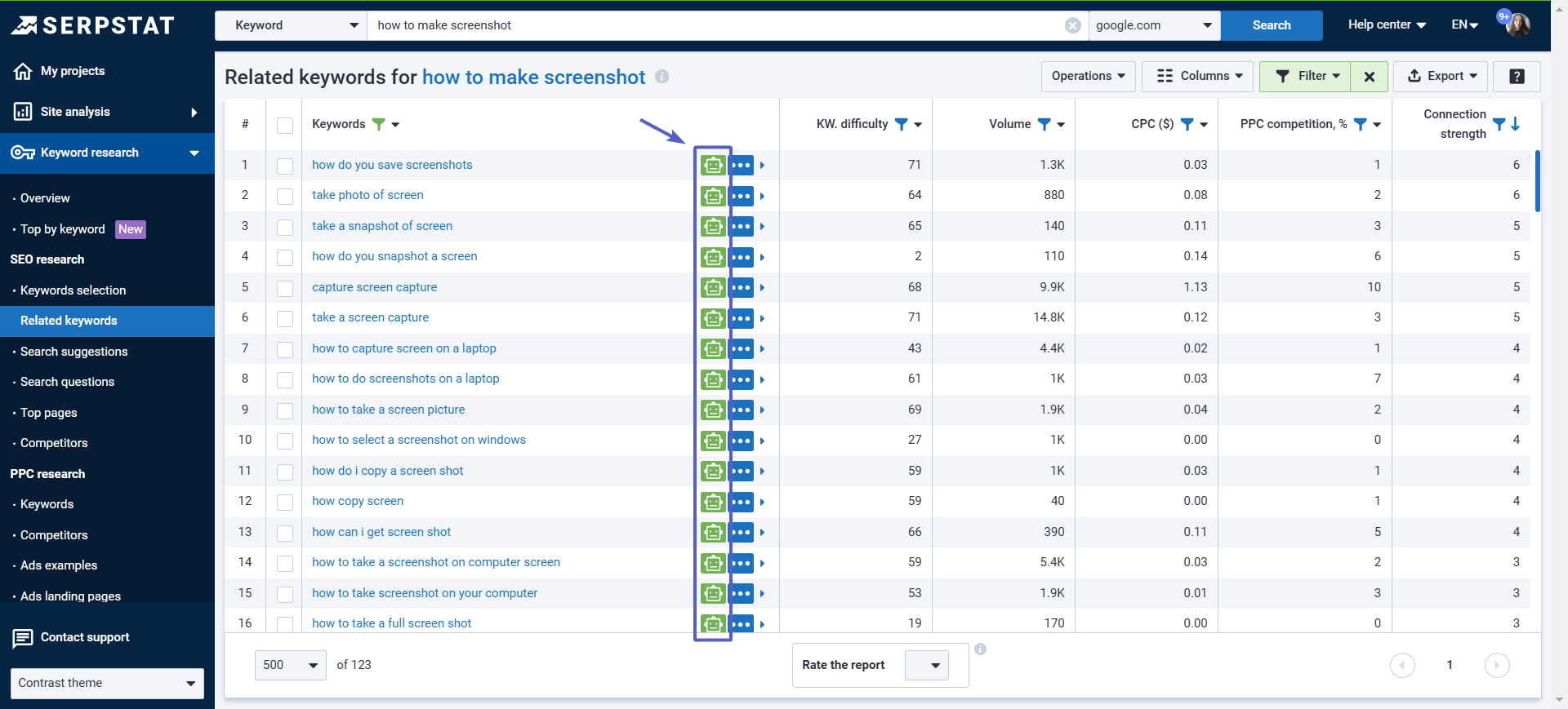 The Keywords batch analysis report has been updated with new features. To synchronize or update the frequency, update the SERP for a keyword or add keywords to a Serpstat database, mark the necessary keywords, click on the button in the form of an arrow in the upper right corner and select one of the operations.