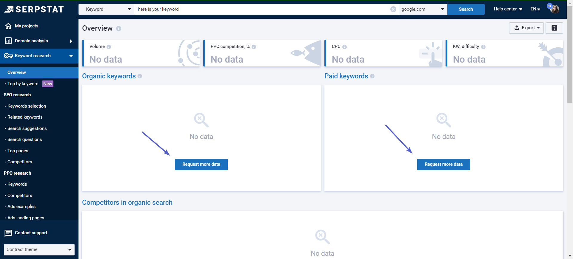 The team has improved the Competitors report and now you can: analyze more than 100 domains in the API; visualize traffic, the number of keywords and the average position on the chart; analyze competitors in SEO and PPC without credits charging off; compare domains on the chart; generate a list of competitors manually.