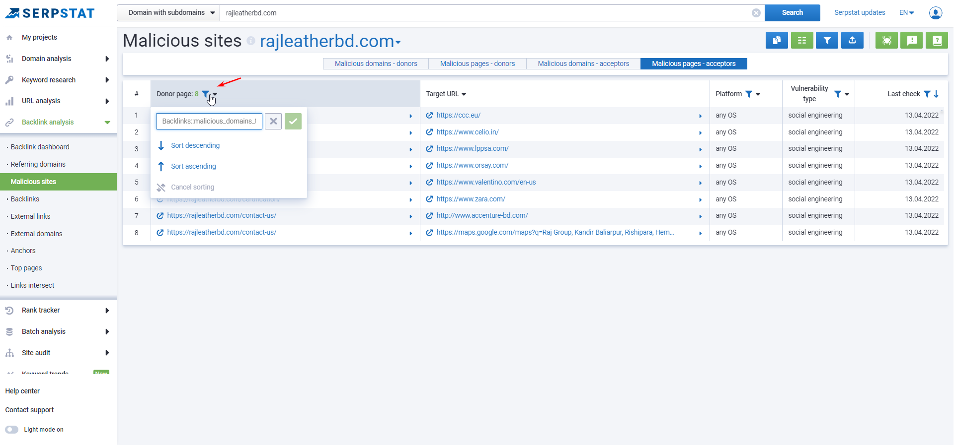 Sorting and filtering by indexation, update and loss dates have been added to the reports of backlinks and external links.