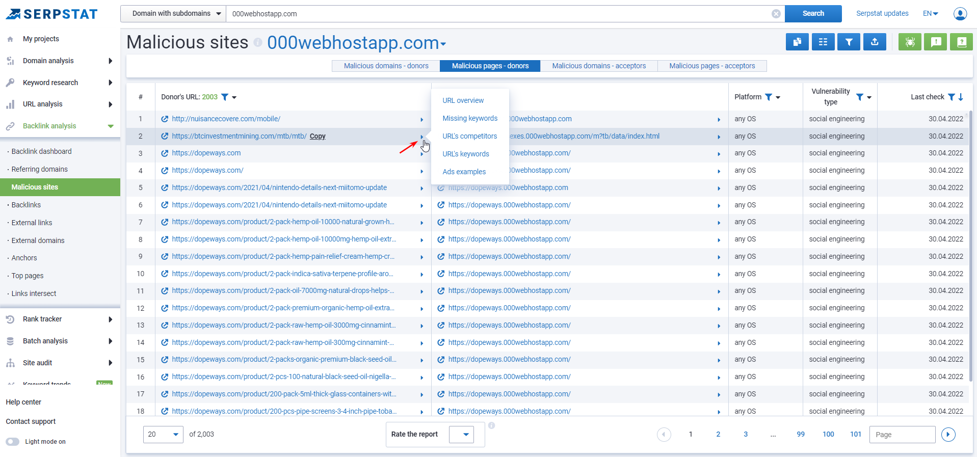 The block with links has been supplemented with new data for the convenience of quick analysis, namely: the number of malicious domains-acceptors and -donors, active links and domain SDR.