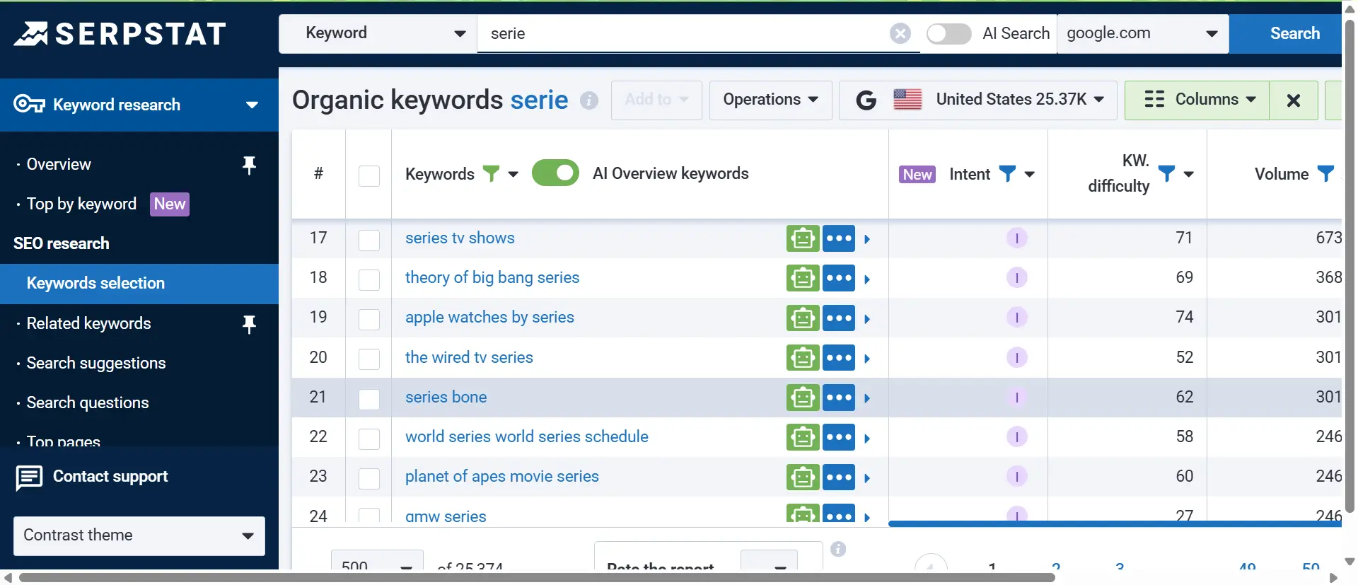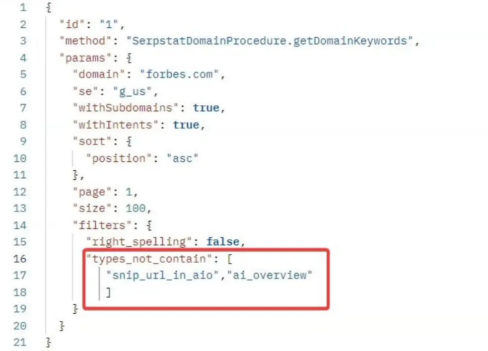 In the method SerpstatDomainProcedure.getDomainKeywords, you can now filter keywords by AI Overview presence in SERPs and whether your domain appears in it. Use types_contain or types_not_contain with "ai_overview" and "snip_url_in_aio" to include or exclude these results.