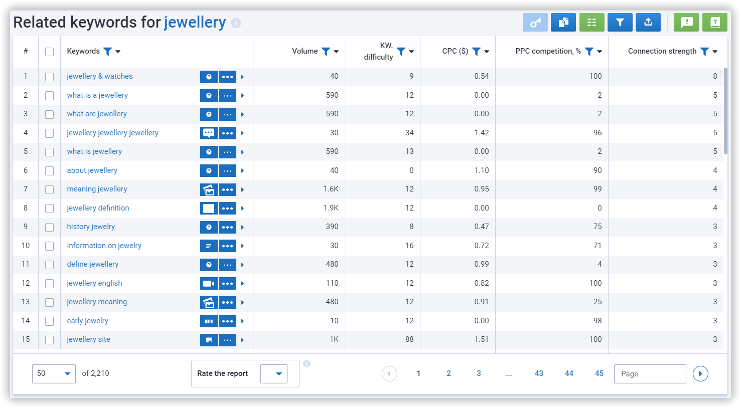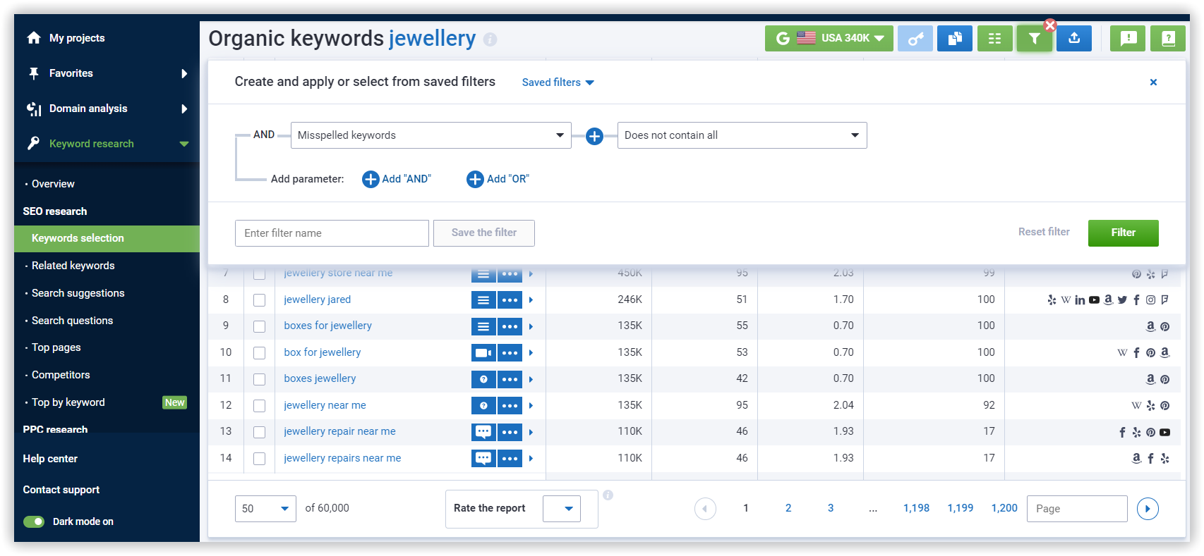 To find keywords, we use several Serpstat reports. First, we go to Keyword Research → SEO Research → Keywords Selection. You can also apply filters if needed.