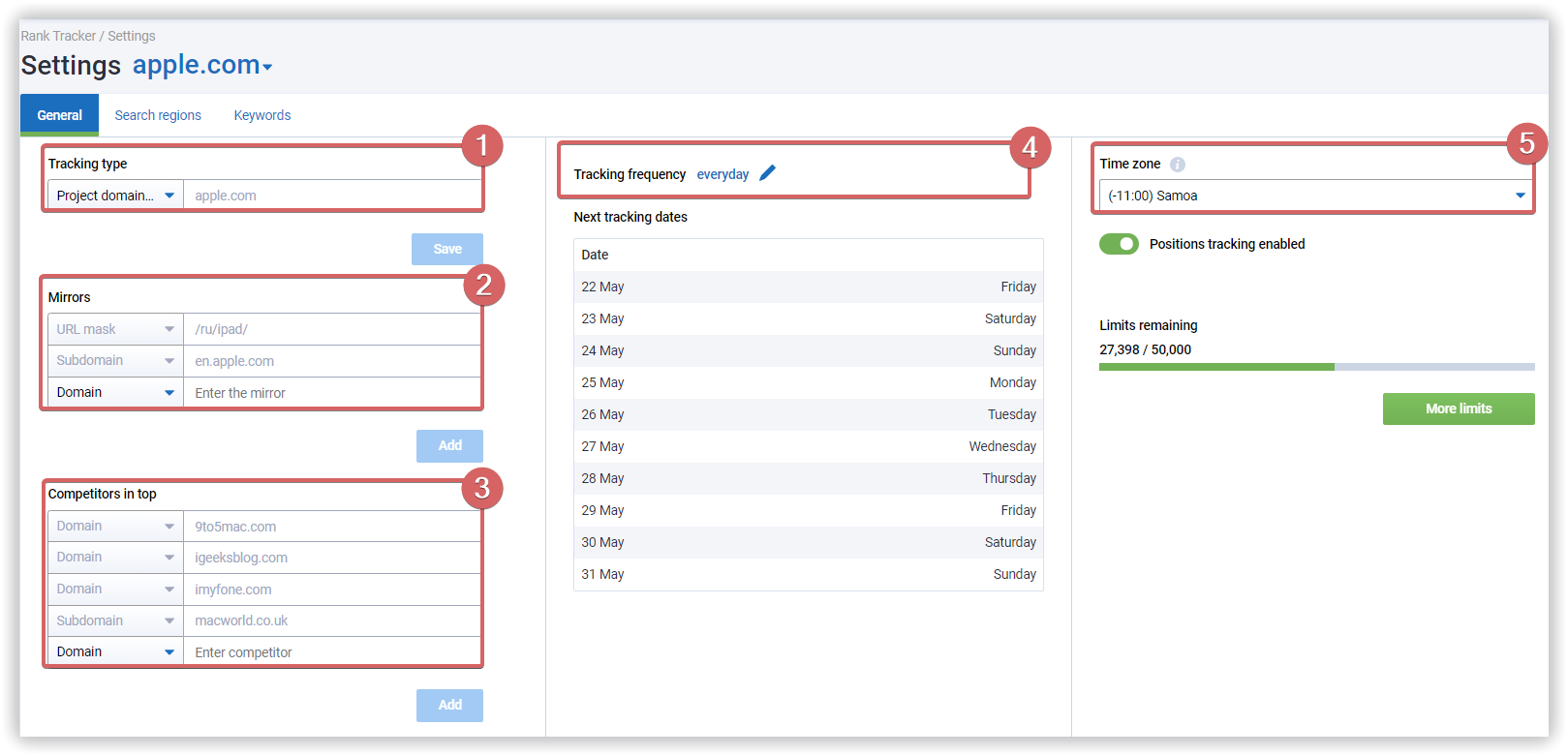 You can upload keywords, divide them into groups by topics, and track your site's positions and the positions of your competitors. You will get all the information on the top 100: