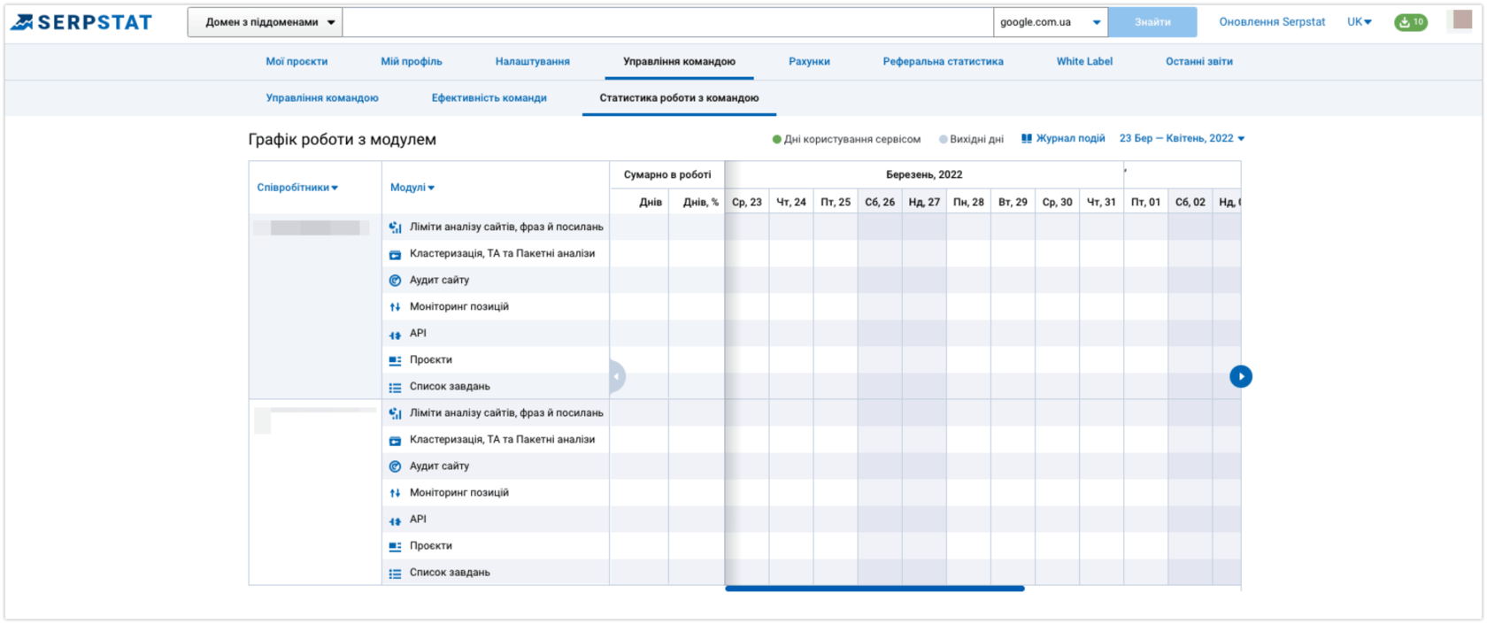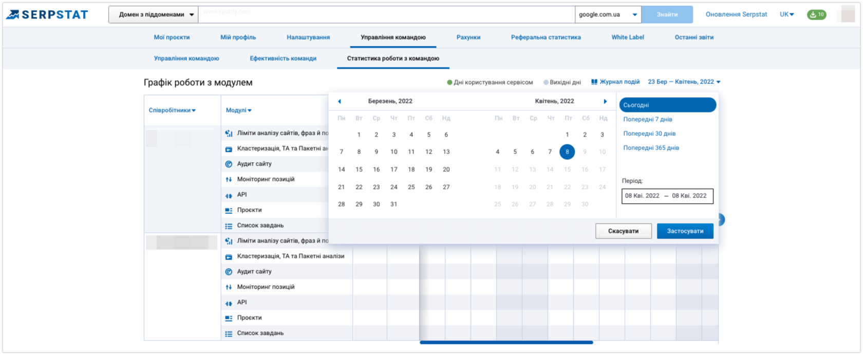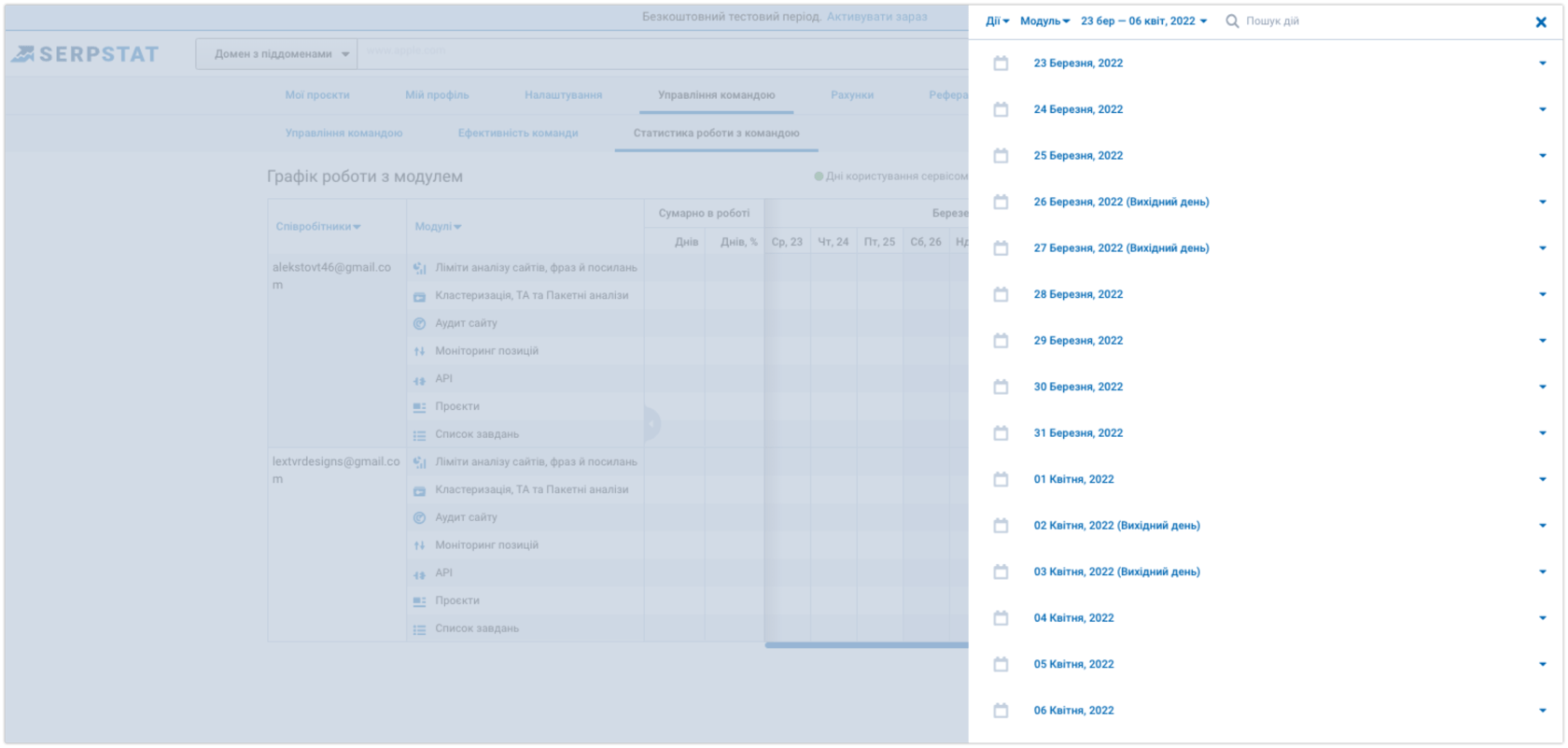 Досвідчені керівники знають, що потрібно розподіляти ліміти сервісу між його учасниками, проте не всі інструменти надають таку можливість. Мультиюзерність Serpstat допомагає клієнтам контролювати робочі процеси та розподіляти доступи між спеціалістами у команді.