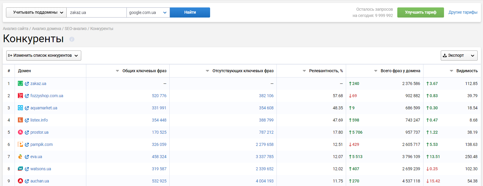 Сперва с помощью Serpstat мы нашли конкурентов проекта. Сделать это достаточно просто: вводим в строку сервиса адрес домена, выбираем поисковую базу, нажимаем «Поиск» и переходим в отчет «Анализ сайта→ Анализ домена→ SEO-анализ→ Конкуренты». Выгружаем конкурентов.