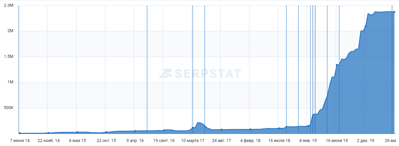 В данном случае Serpstat помогает решать эти задачи. Для всего проекта в целом, а также каждого субдомена отдельно, мы имеем возможность отслеживать видимость, количество ключевых фраз в поиске, динамику трафика, внешние ссылки и прочие SEO-показатели.