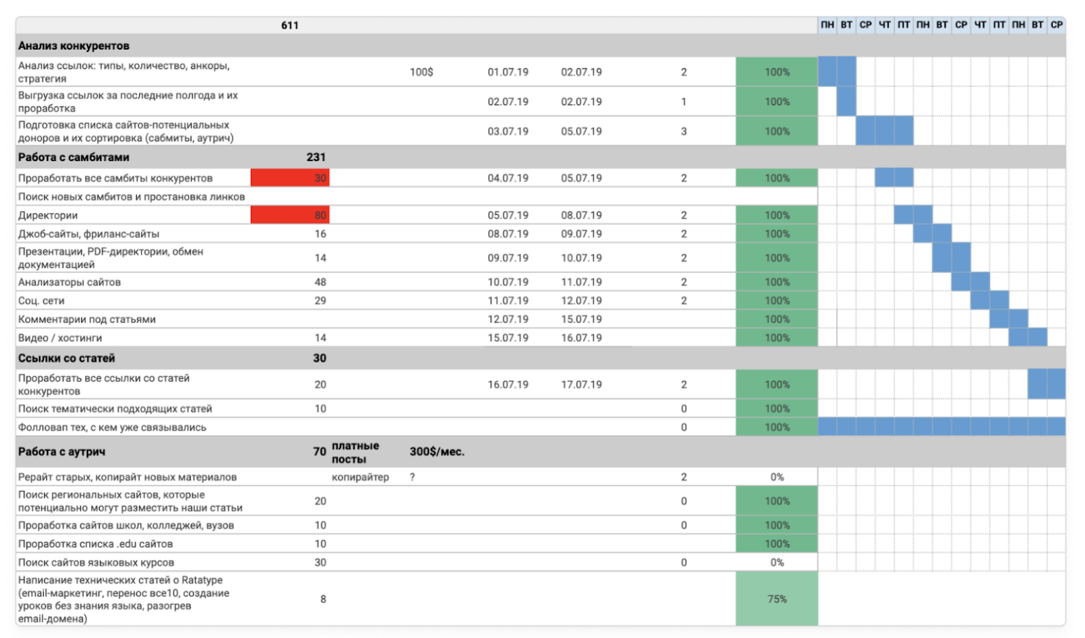 Так как основной задачей по проекту для нас было наращивание ссылочной массы на новые сайты для получения большего количества посетителей на сайт, наш план выглядел таким образом: