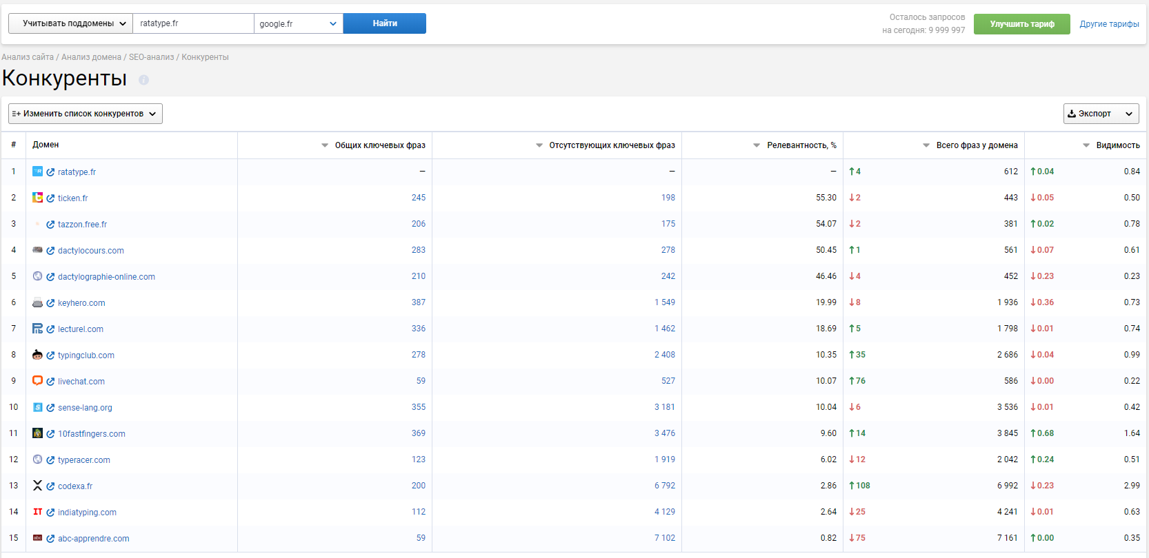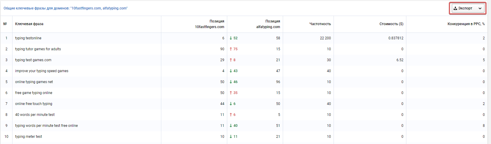В отчете видим пересечение семантики сайтов. Те фразы, которые используют оба конкурента, но не используете вы, с высокой вероятностью подойдут и для вашего сайта. Для дальнейшего анализа можно экспортировать данные: