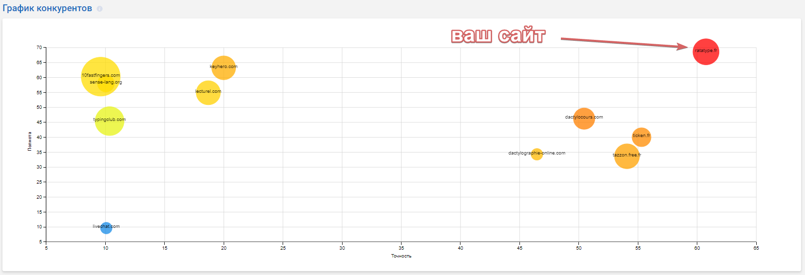 Также интересен график конкурентов в Суммарном отчете, который показывает релевантность конкурентов на основе метрик точность и полнота семантики. Чем ближе сайт на графике к вам, тем более релевантным конкурентом он является.