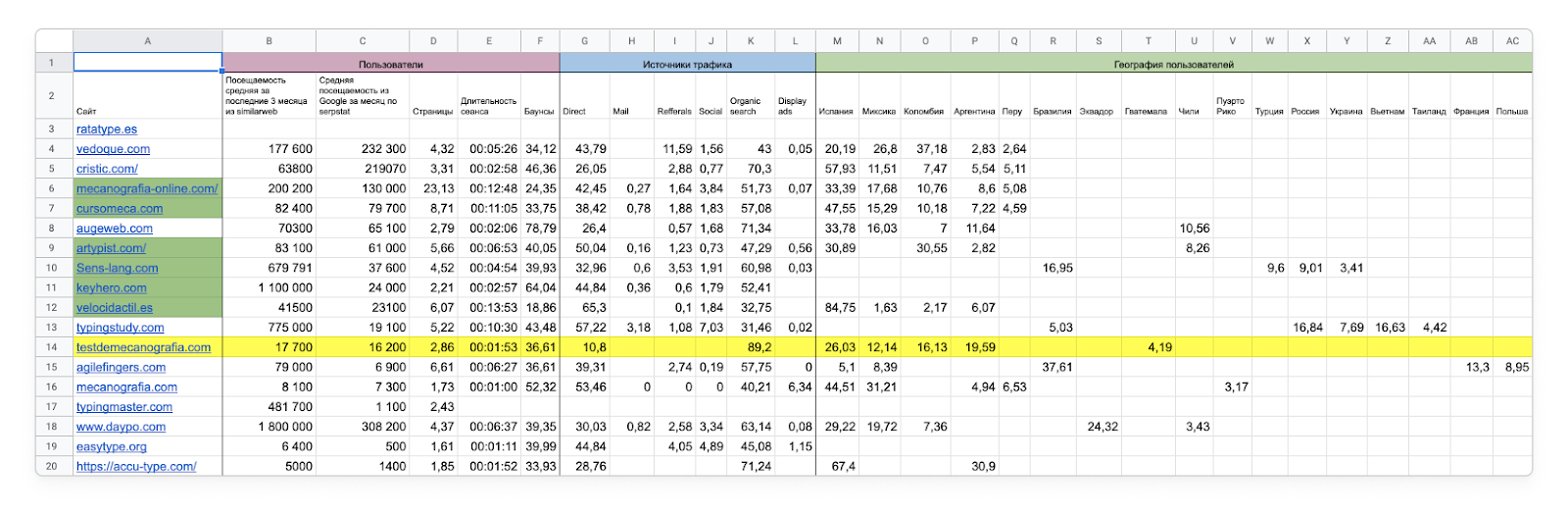 Далее заносите конкурентов в таблицу со всеми необходимыми метриками: