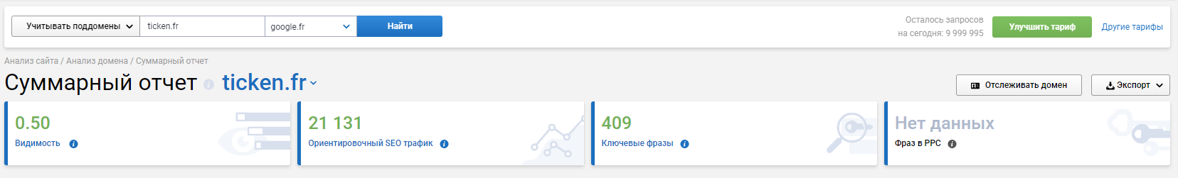 Берем каждого конкурента из таблицы и пробиваем его в Serpstat, смотрим все основные метрики сайта. В первую очередь обращаем внимание на ключевые SEO-показатели, их вы найдете в Суммарном отчете:
