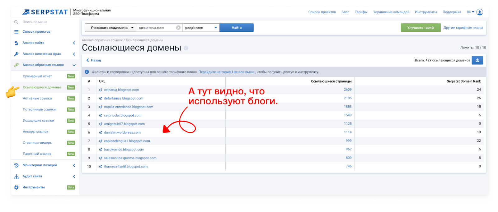 Пример анализа сайта нашего конкурента из списка. Заходим в отчет «Анализ ссылок→ Ссылающиеся домены» и смотрим, кто на него ссылается: