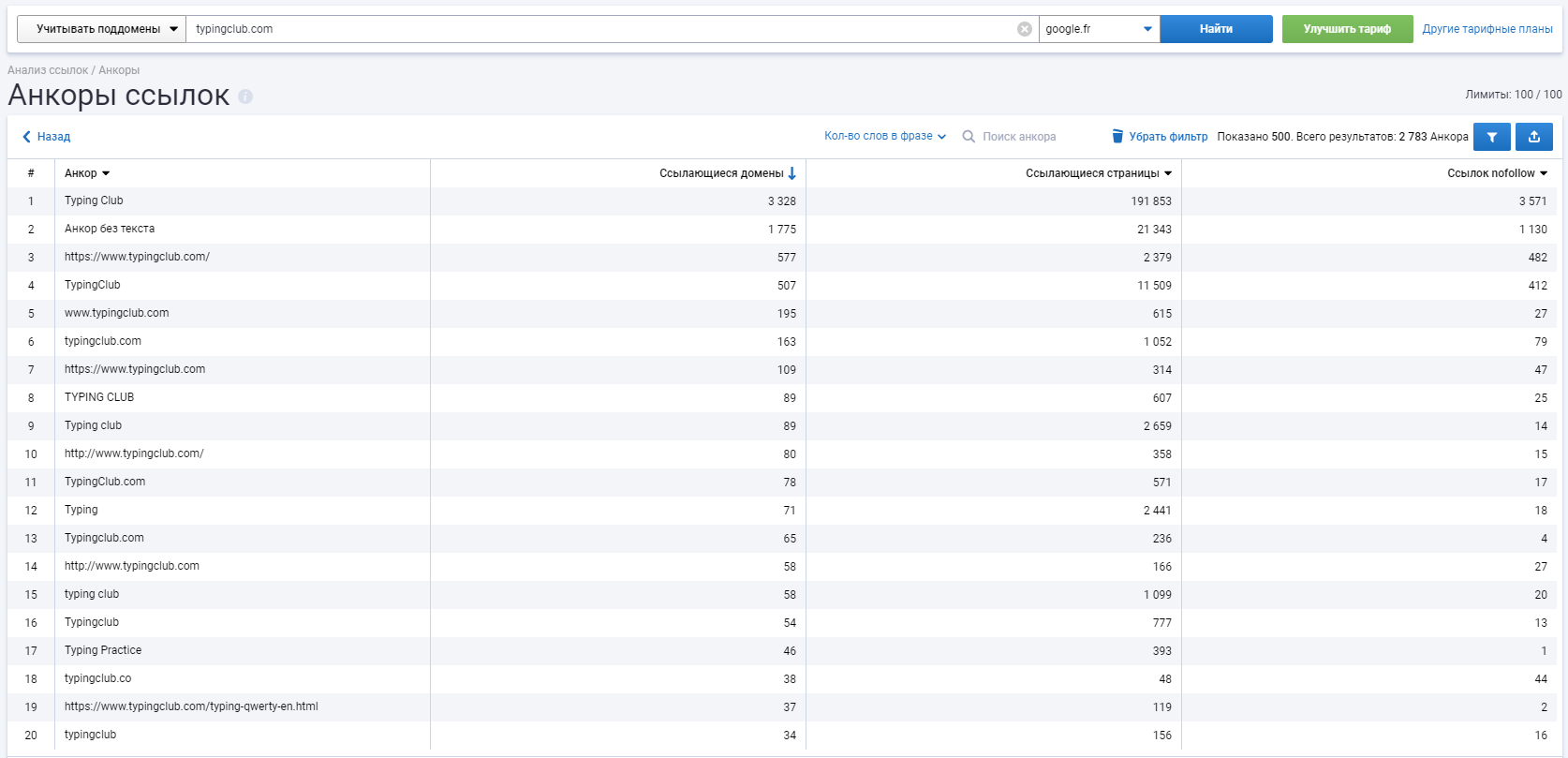 Далее переходим в отчет «Анкоры ссылок», что посмотреть, какие анкоры у обратных ссылок конкурента. Это поможет в составлении собственного анкор-листа.