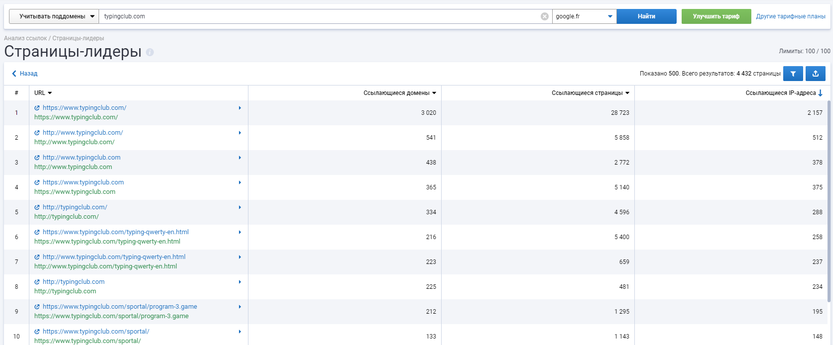 Идем в «Страницы-лидеры», чтобы увидеть страницы конкурента с наибольшим числом ссылок. Так можно понять, на что он ставит фокус в продвижении: