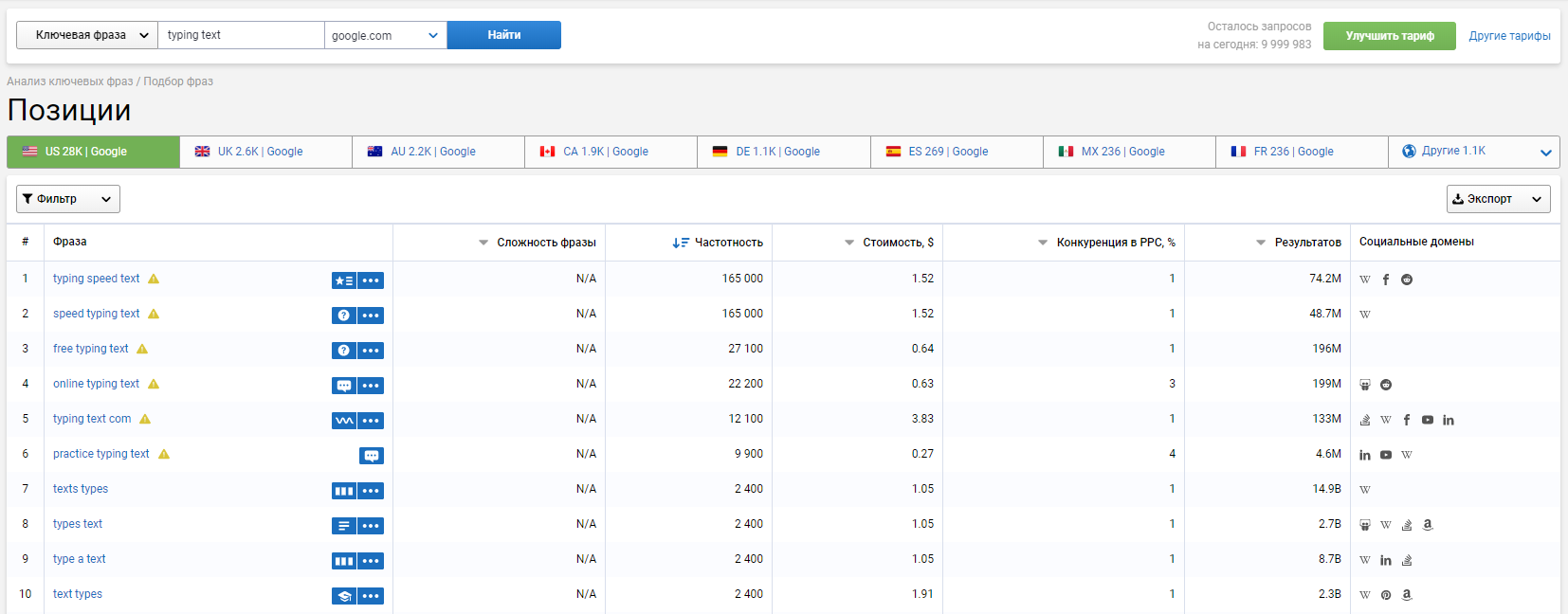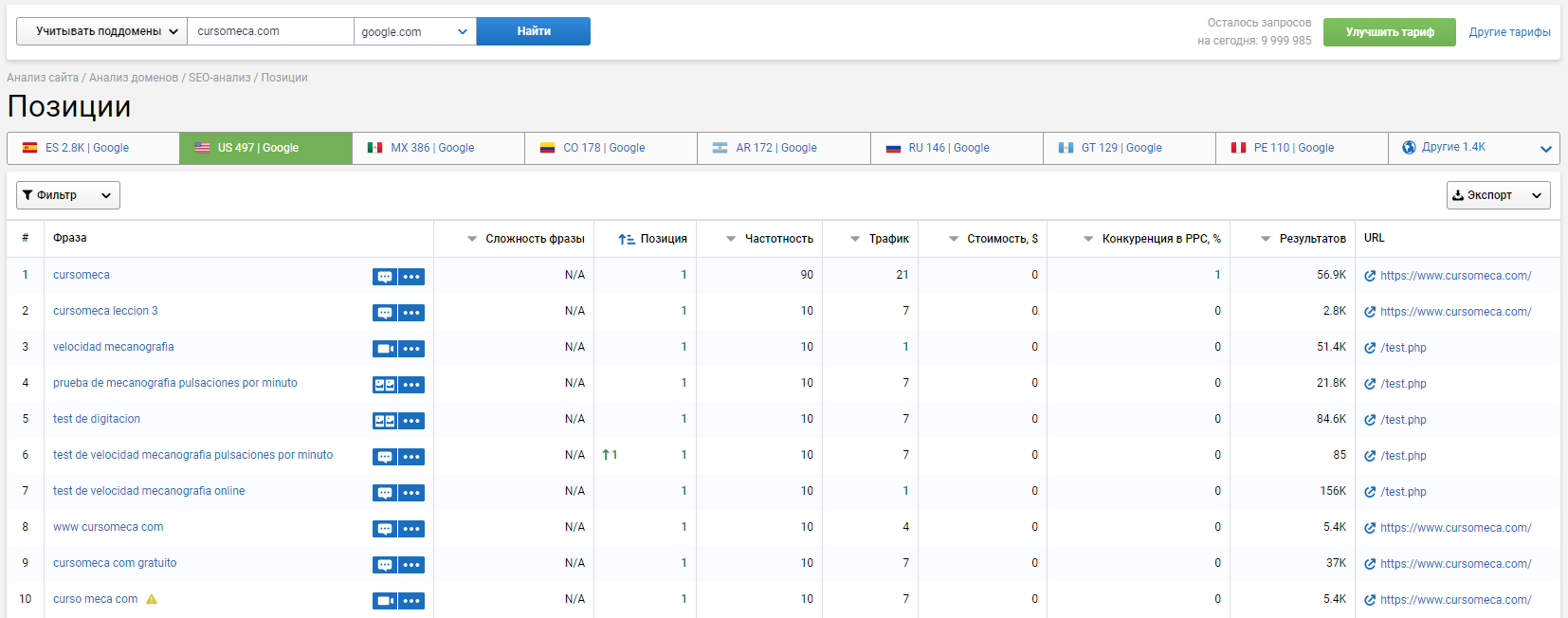 Так как у нас уже есть список конкурентов, необходимо найти их ключевые фразы. Для этого используем отчет «Анализ сайта / Анализ доменов→ SEO-анализ→ Позиции». Смотрим, по каким фразам ранжируются они и берем на заметку самые «сочные».