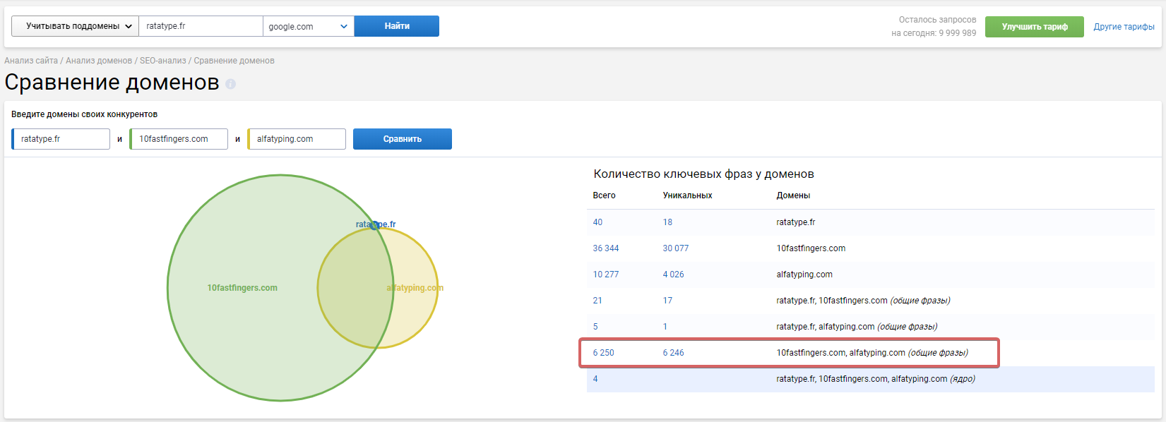 Также Serpstat дает возможность сравнить семантику доменов и найти недостающие фразы. Это можно сделать с помощью отчета «Анализ сайта→ Анализ доменов→ SEO-анализ→ Сравнение доменов»: