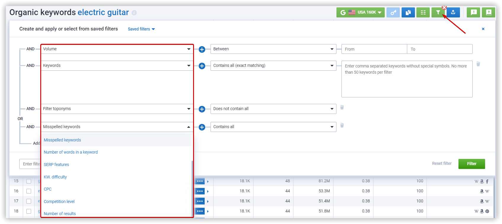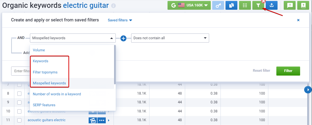 How can you filter out these keywords? Serpstat offers a variety of options. You can exclude any search terms (keyword), as well as place names (filter toponyms), delete typos (misspelled keywords), and more.