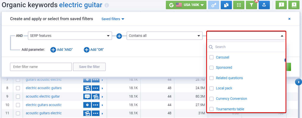 If you want to optimize your website for SERP Features, such as rich snippets, knowledge graphs, or local packs, you should pay special attention to keywords with Special elements in SERPs. You can select any type of snippets from the filters and get the list of keywords that rank for it.