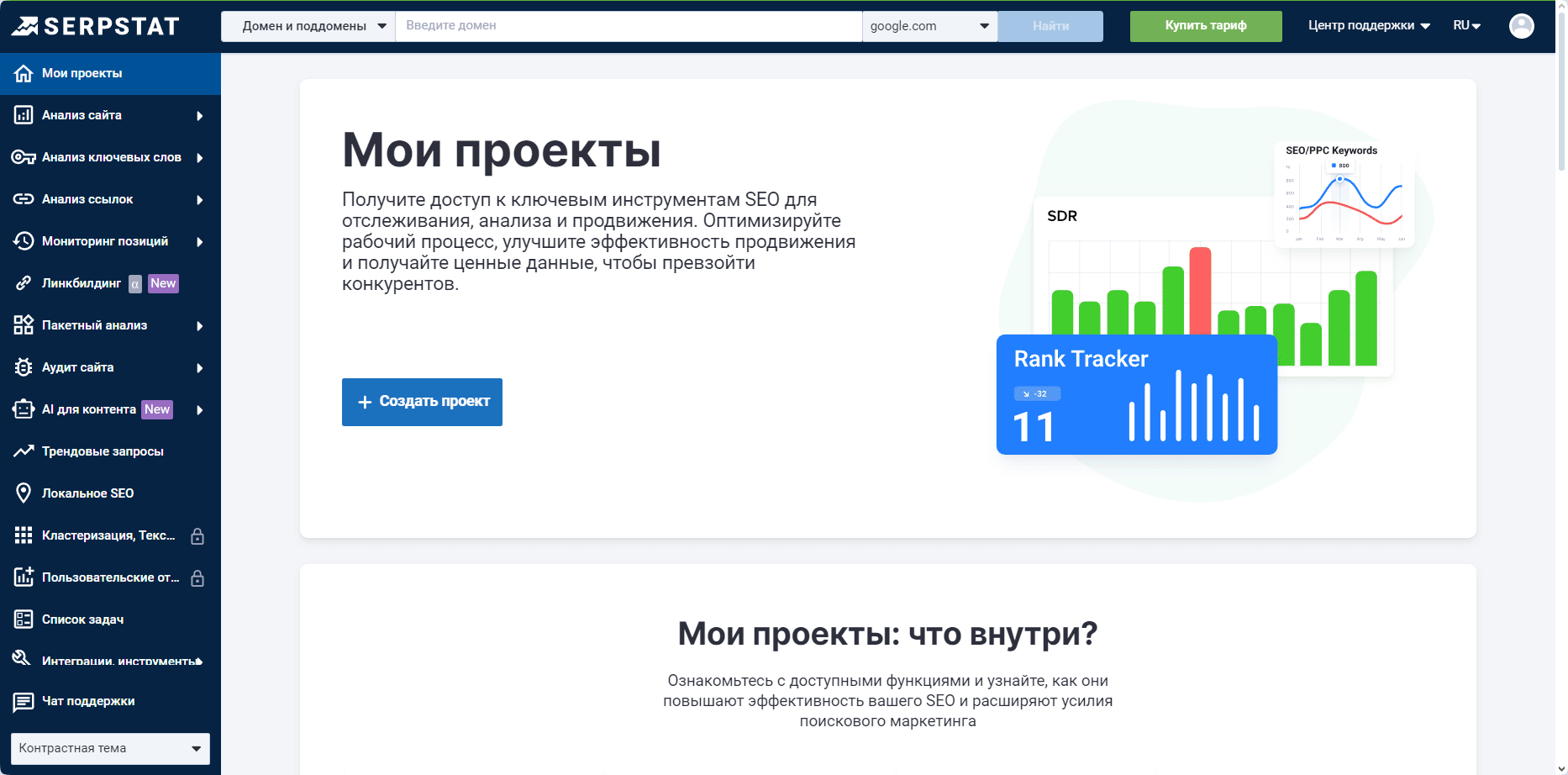 Это главная страница после авторизации в Serpstat.