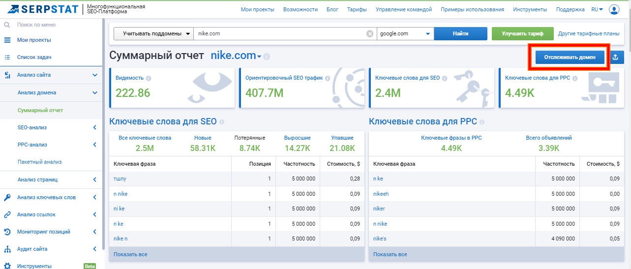 Анализируя сайт в разделе «Анализ домена» — «Суммарный отчет», (1) нажмите кнопку «Отслеживать домен» или (2) звезду в поисковой строке. Сайт автоматически появится в разделе «Мои проекты».