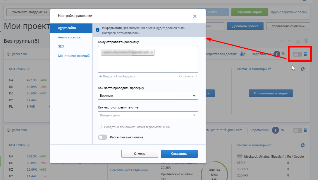 Анализ домена» (Суммарный отчет), «Анализ ссылок», «Аудит сайта» и «Мониторинг позиций» (при настройке рассылки по «Анализу домена» и «Анализу ссылок» первое письмо будет отправлено на указанную почту сразу, остальные — по расписанию):
