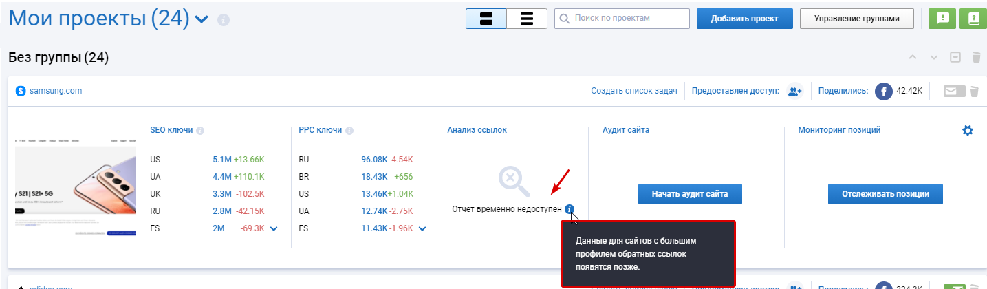 * В разделе Анализа ссылок вы можете увидеть сообщение о том, что «Отчет временно недоступен». Это связано с тем, что у анализируемого домена большой профиль обратных ссылок, поэтому информация по таким сайтам временно недоступна в нашем сервисе, но появится позже.