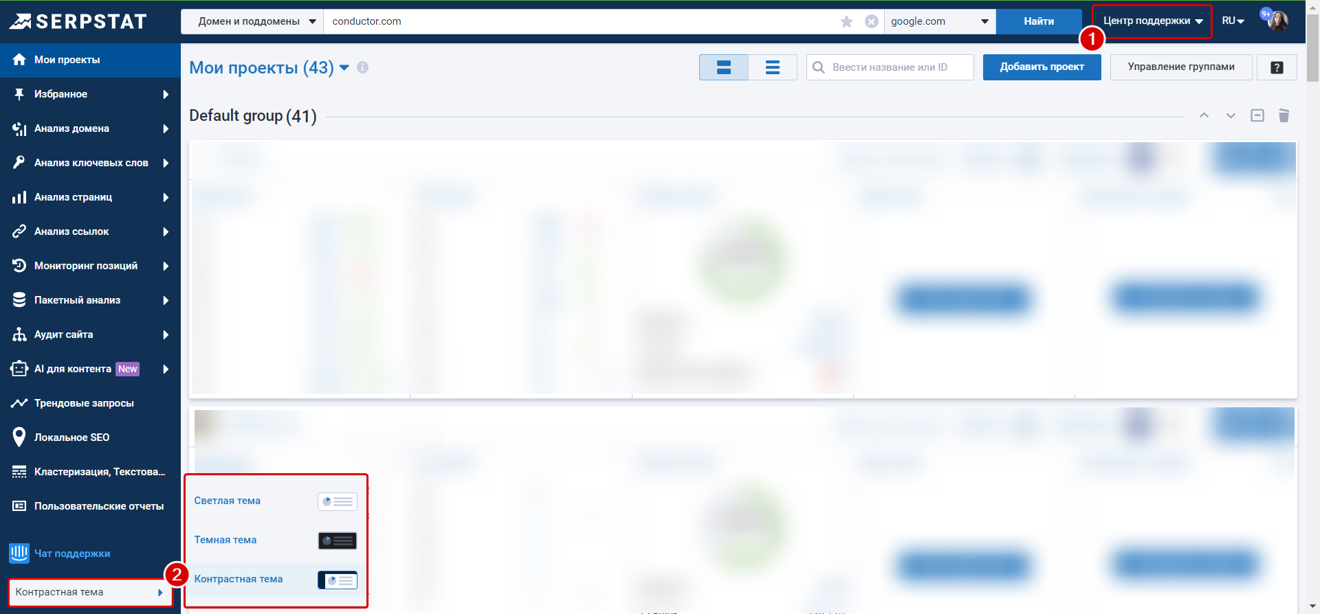 1. Через Центр поддержки в правом верхнем углу вы сможете перейти к нашему блогу, обновлениям Serpstat, базе знаний, Академии Serpstat, Политике конфиденциальности.